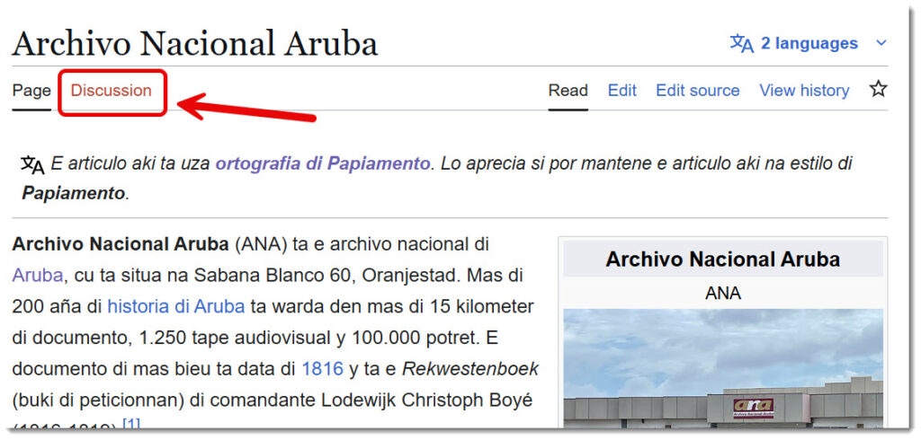 historia di edicion den e tab ‘historia’ di e articulo di Archivo Nacional Aruba