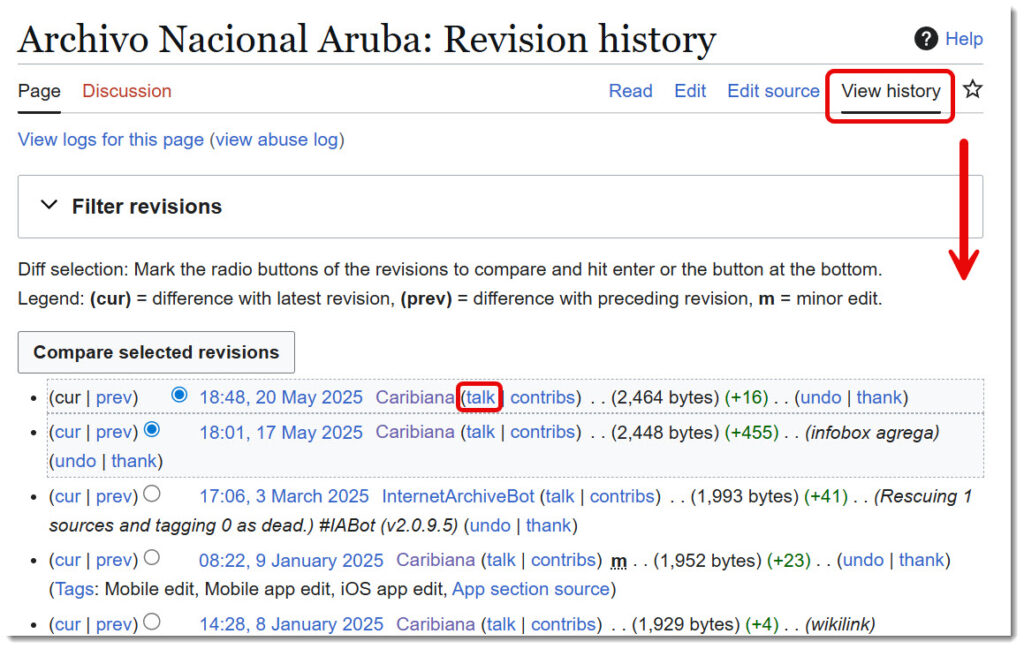 Ta posibel tambe pa tuma contacto cu e boluntarionan cu anteriormente a traha riba e articulo tocante bo organisacion y pidi nan pa adapta e informacion. Cada articulo di Wikipedia tin un tab ‘Historia’ (View history) unda por wak exactamente kende a traha riba e articulo.